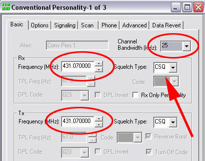 Next, click on the "Conventional Personality" tab followed by the"Conv Pers 1" tab. We are only concerned with Conventional Personality 1 since we only use Channel 1. You will have to set up the additional personalities if you want additional channels available. Remember, the radio defaults to Channel 1 upon restart.