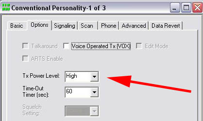 Under the "Options" tab is where you will select the transmit power level. You previously set the "High" and "Low" power levels in Watts. Now you have to decide which one you have to use.